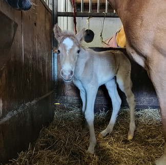 18 Maart was Issy uitgerekend, maar het veulen liet nog even op zich wachten. 29 Maart zag ik druppels aan de uier hangen. De hele nacht hield ik alles via de camera in de gaten. Op 30 maart om even na half 5 's morgens was het zo ver. Issy begon met de bevalling. Onderweg in de auto kon ik alles volgen. Toen ik aankwam op stal, was ik blij dat ik er zo snel was. Het vlies om het veulen was niet helemaal open gegaan. Ik moest zelf het vlies van zijn hoofd af halen zodat hij goed kon ademen. Na een blik onder de staart, bleek het een hengstje te zijn!